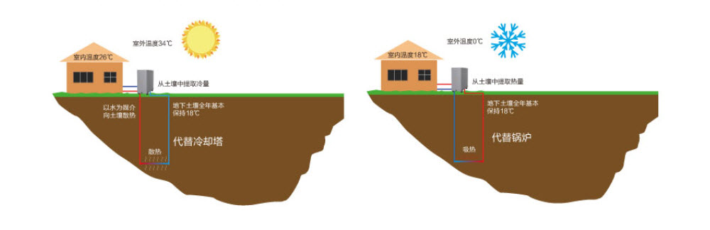 地源熱泵技術(shù)是利用地下淺層熱資源(巖層土、地表水)作為冷熱源來(lái)制取冷水和熱水的機(jī)組。由于土壤溫度相對(duì)穩(wěn)定,在冬季,機(jī)組將土壤中的熱量提取出來(lái),制取熱水,供建筑物空調(diào)采暖及其他用途;在夏季,機(jī)組將室內(nèi)的熱量提取出來(lái),釋放到土壤中,達(dá)到夏季空調(diào)制冷的目的。