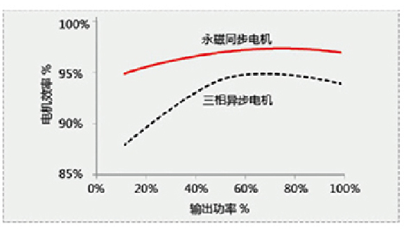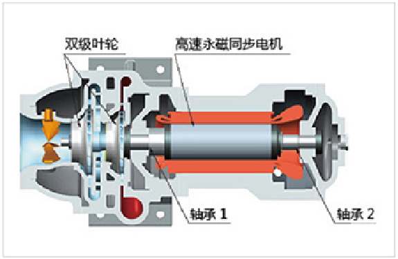·采用大功率高速永磁同步電機(jī),功率達(dá)400KW以上,轉(zhuǎn)速達(dá)18000rpm以上。且其體積小,重量輕,400KW的高速永磁同步電機(jī)重量相當(dāng)于75KW的交流感應(yīng)電機(jī)。高速永磁同步變頻電機(jī)的啟動(dòng)電流小,電機(jī)效率均達(dá)到96%以上,效率可高達(dá)98.2%,大大提高機(jī)組滿負(fù)荷于部分負(fù)荷的運(yùn)行能效。