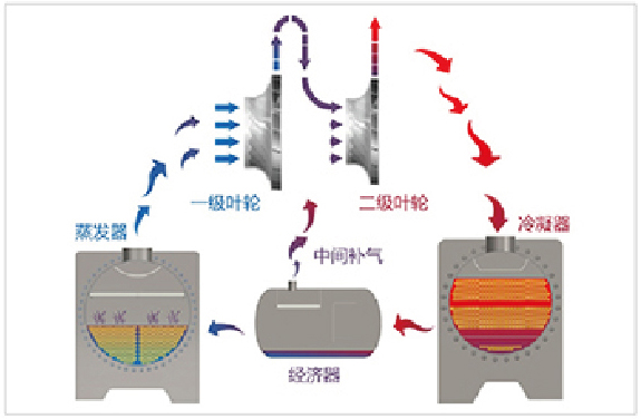 ·雙級(jí)壓縮技術(shù)與擴(kuò)壓器技術(shù)大大拓展了機(jī)組的運(yùn)行范圍,機(jī)組可在冷卻水進(jìn)水溫度12~35℃范圍內(nèi)穩(wěn)定運(yùn)行,實(shí)現(xiàn)10~100%負(fù)荷無(wú)極調(diào)節(jié)。